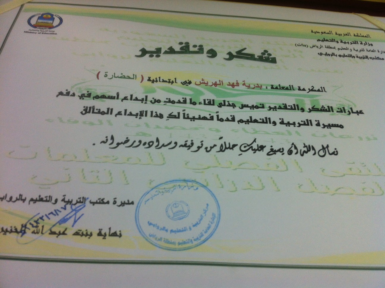 شهادة شكر وتقدير للمعلمة المتميزة موسوعة